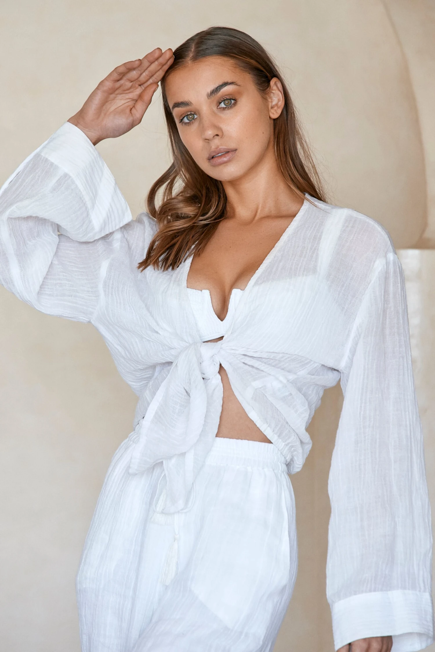 Our best selling beachwear has a new look. Designed in a supple crinkle linen, the Tahiti Tie Top features a deep V front and elegant, billowing sleeves, and adjustable front tie with an elastic band hidden in the back, for that perfect fit. The picture-perfect addition to its bottom the Tahiti Pant.